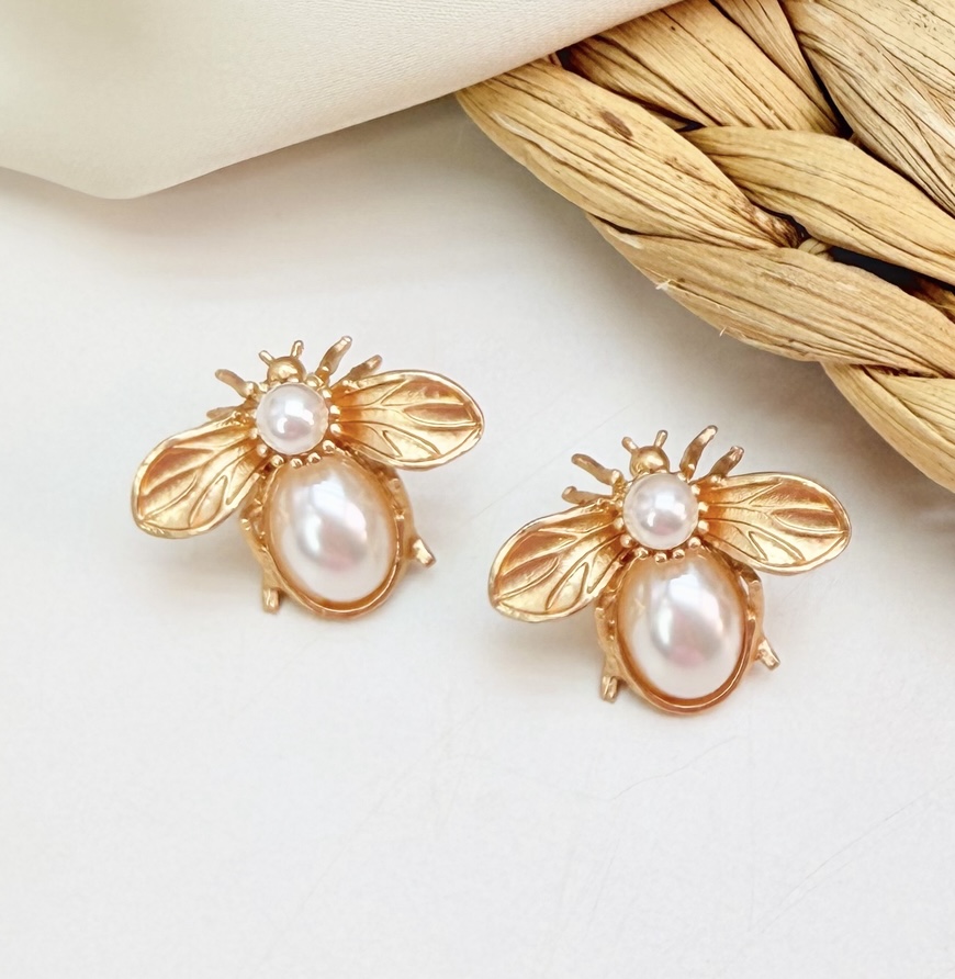 Brinco FOZ abelha e perola fosca folheado ouro