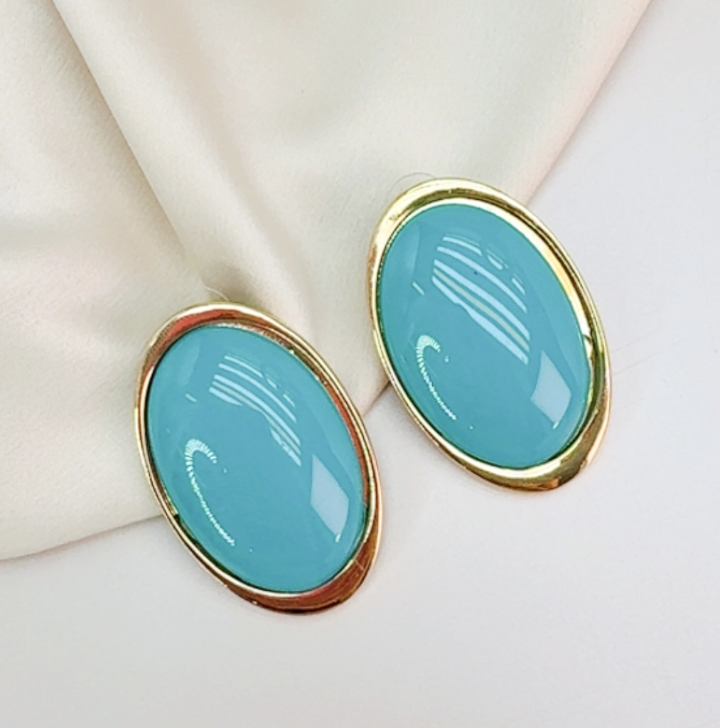 Brinco FEDRA max boton TURQUESA meio oval folheado a ouro