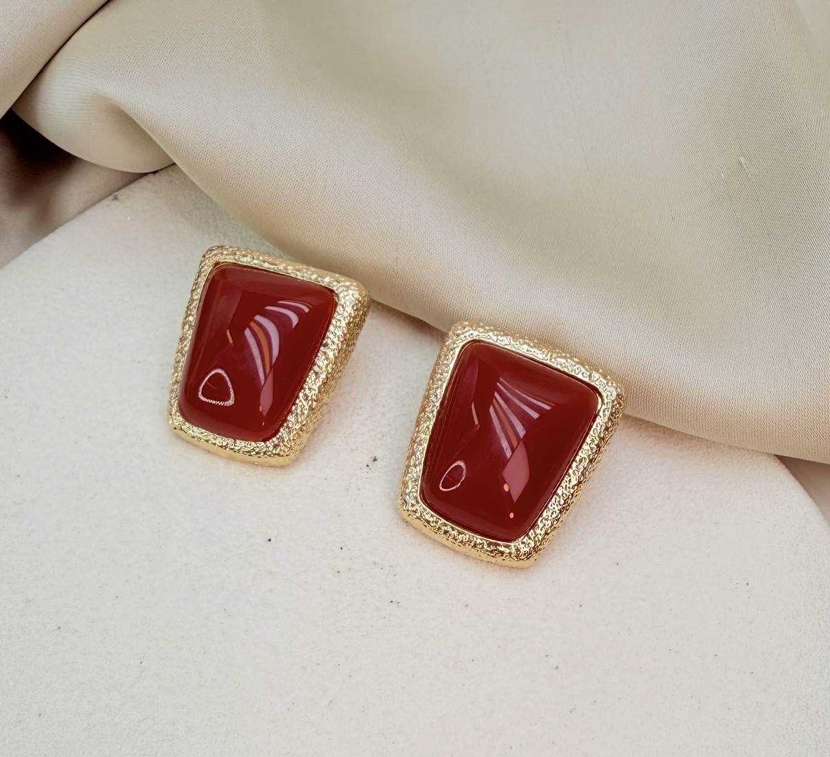 Brinco MOTA boton geométrico pedra vermelha folheada a ouro