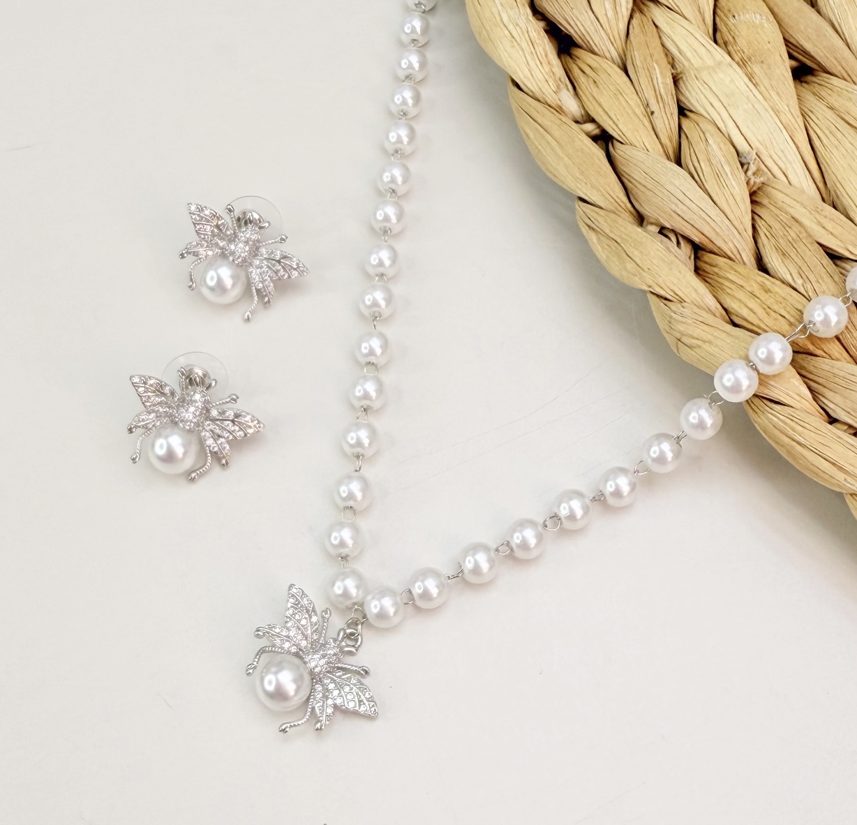 Conjunto FOZ colar mini pérolas com pingente de abelha folheada a prata
