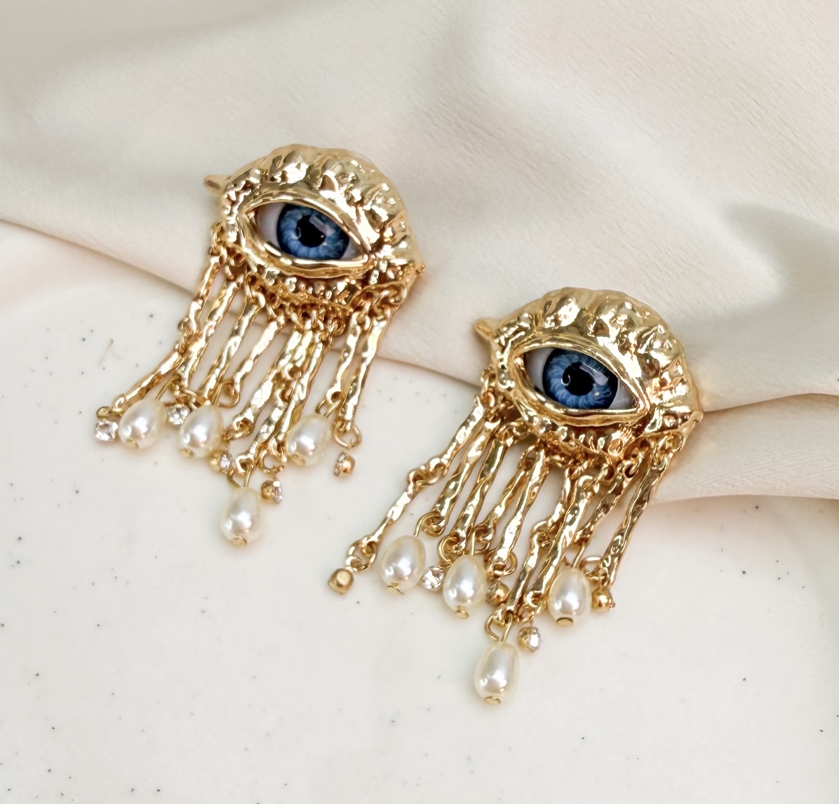 Brinco BARNEY olho AZUL com pérolas folheada a ouro