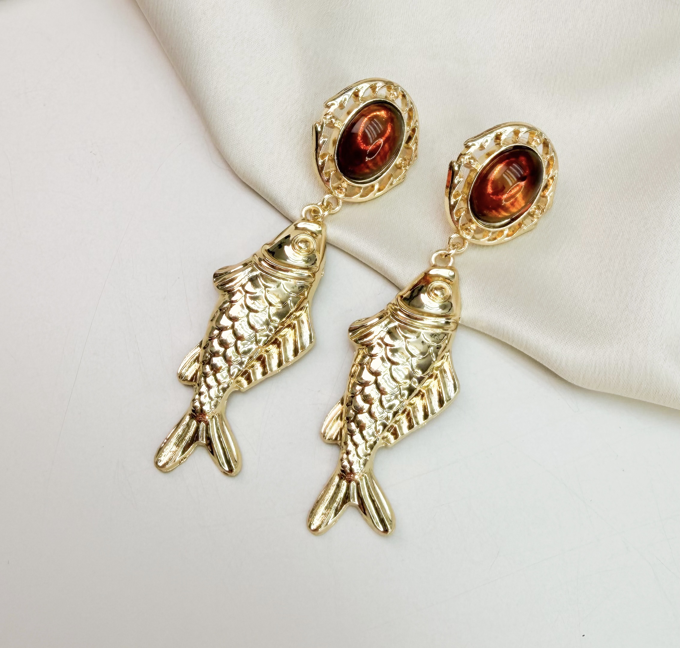 Brinco HORATIA pedra CARAMELO com peixe folheada a ouro