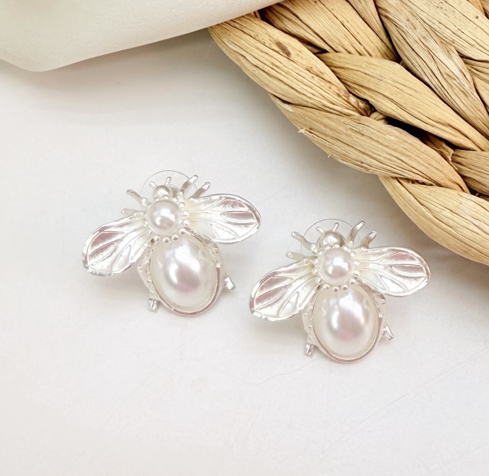 Brinco FOZ abelha e perola fosca folheado prata